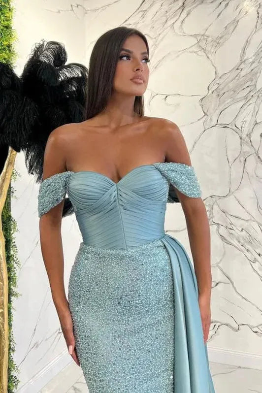 Luxurious Mermaid Off-the-Shoulder Sequins Satin Sky Blue Floor Length Evening Dresses