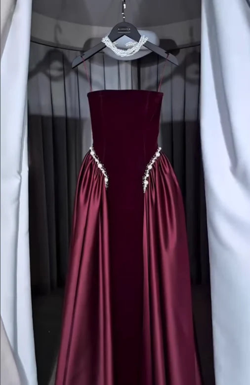xuewuba's Elevate your regal look with this burgundy strapless ball gown. It features a luxurious velvet bodice for opulent allure, a voluminous satin skirt for dramatic movement, and crystal accents at the waist for refined glamour. The strapless design adds a touch of classic elegance, making it perfect for formal galas, black-tie weddings, or any occasion where you want to blend timeless sophistication with modern luxury.