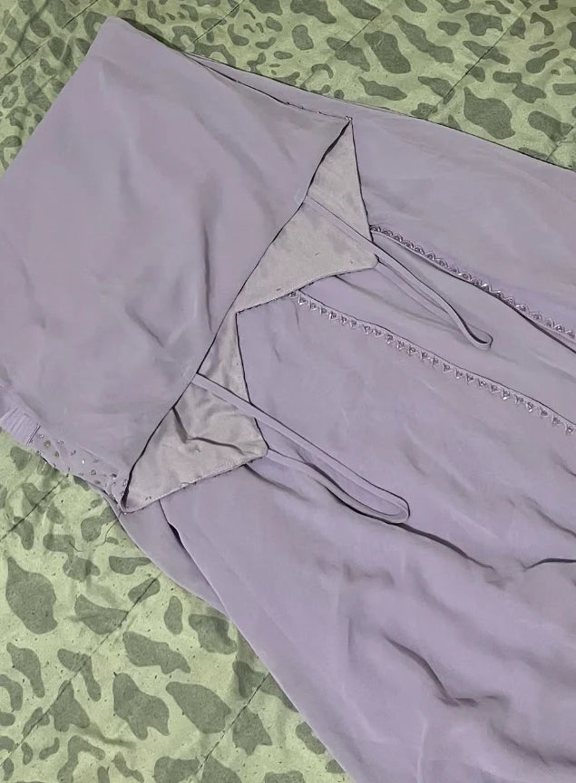 xuewuba's Elevate your vintage-glam look with this lavender chiffon beaded maxi dress. It features intricate beadwork and rhinestone detailing on the bodice for opulent allure, delicate spaghetti straps for refined charm, and an asymmetric chiffon hem for modern flair. The lightweight fabric ensures graceful movement, making it perfect for formal events, proms, or any occasion where you want to blend retro sophistication with contemporary style.