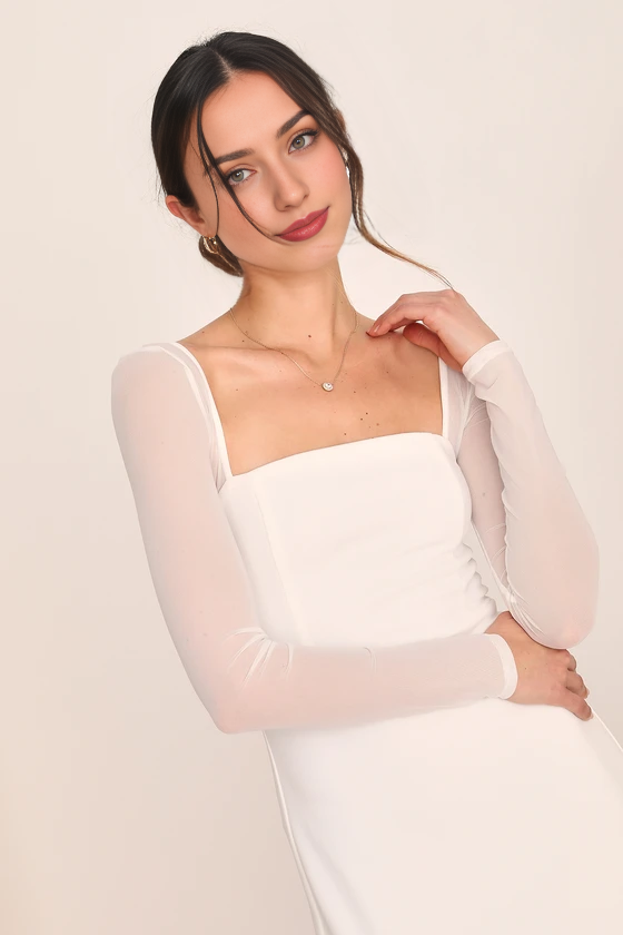 Lovingly Yours Square Neck White Mesh Long Sleeve Wedding Dress With Floor Length