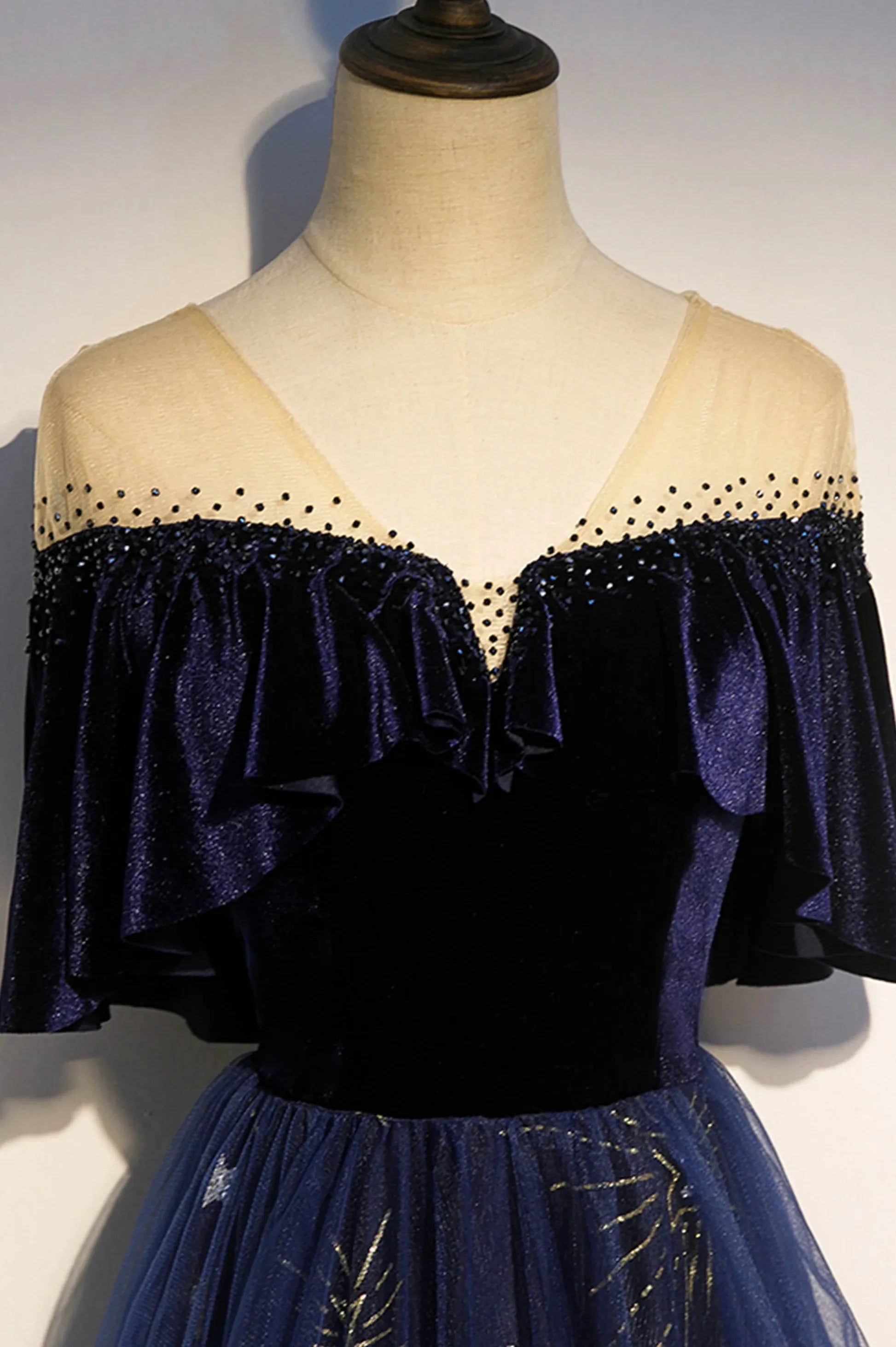 xuewuba's Elevate your ethereal allure with this navy blue velvet and celestial tulle off-shoulder ball gown. It features a luxurious velvet off-shoulder bodice with delicate beading for opulent charm, a voluminous tulle skirt adorned with celestial embroidery (stars, moons, and mythical motifs) for whimsical elegance, and a lace-up back for a tailored fit. The deep navy blue hue combined with shimmering details ensures a captivating presence, making it perfect for formal events, proms, or any occasion where you want to embrace celestial-inspired glamour with show-stopping style.