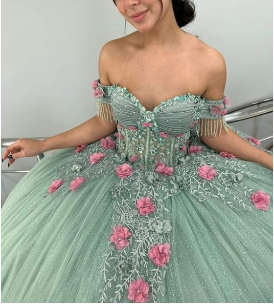 Off-the-Shoulder 3d Flower Applique Prom Dresses
