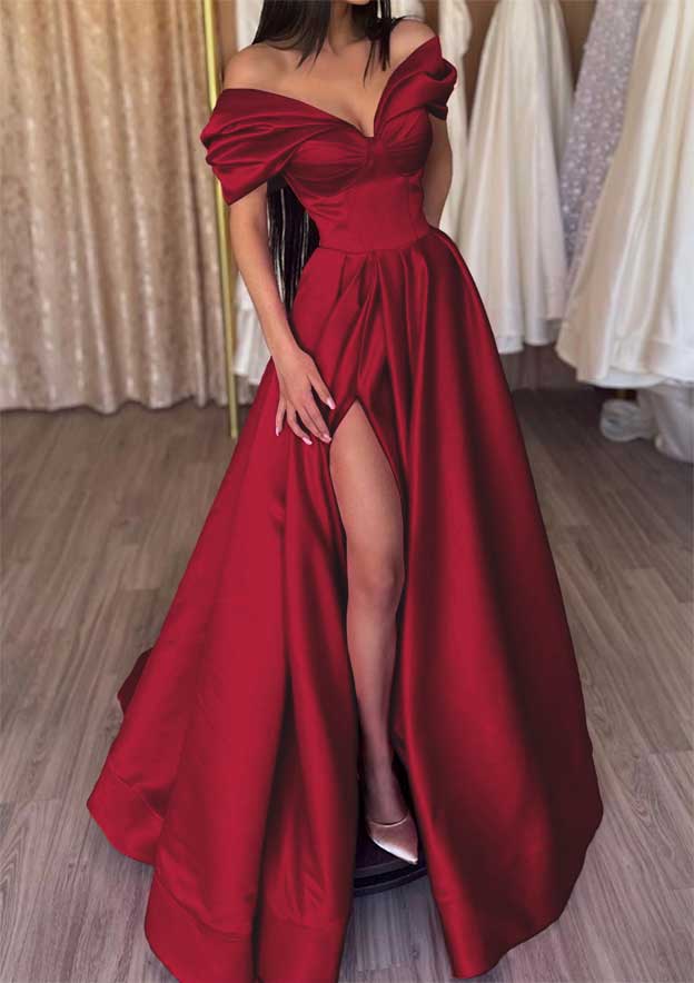 Off-the-Shoulder Short Sleeve Satin Long/Floor-Length Prom Dress With Ruffles Split