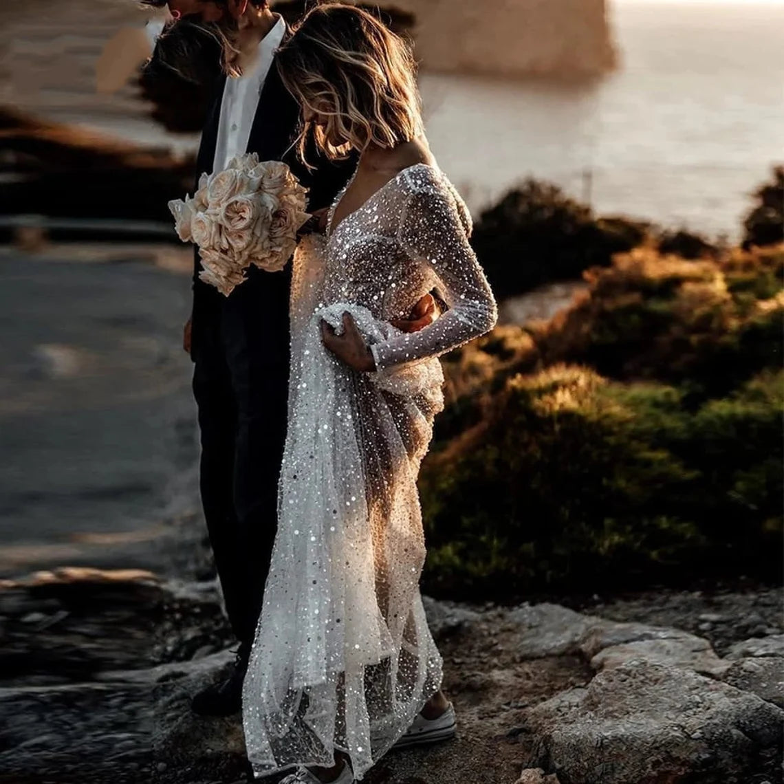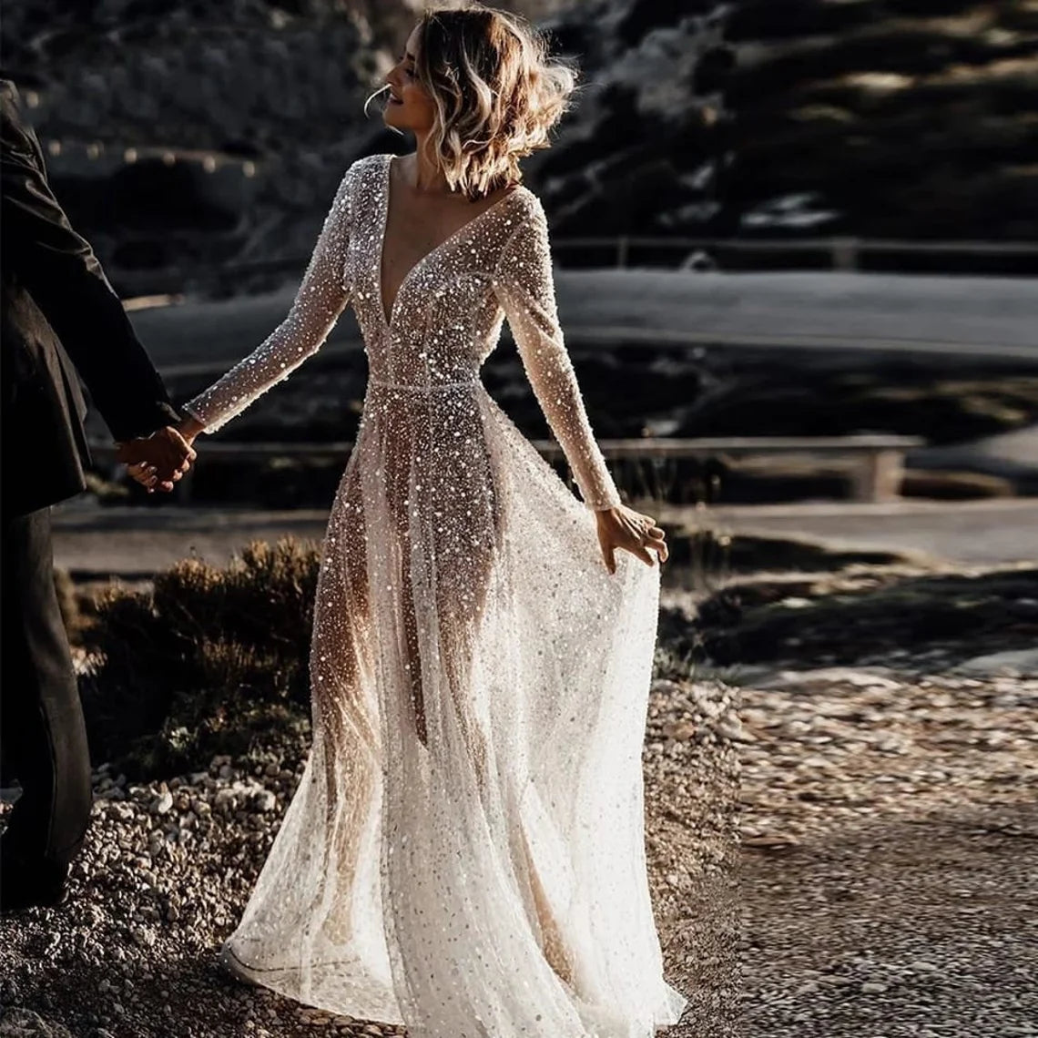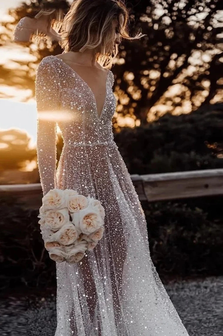 See Through Sequin Beaded Deep V Neck Long Sleeves Sparkly Dress A-Line Sparkly Bridal Gown
