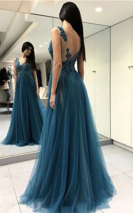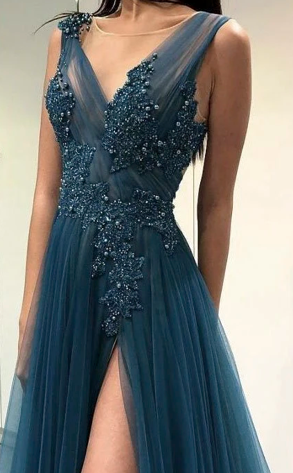 Xuewuba Dress V-neck Ethereal Tulle Front Split Floor-length Dress With Appliques And Beading Prom Dress Formal Wear Dresses