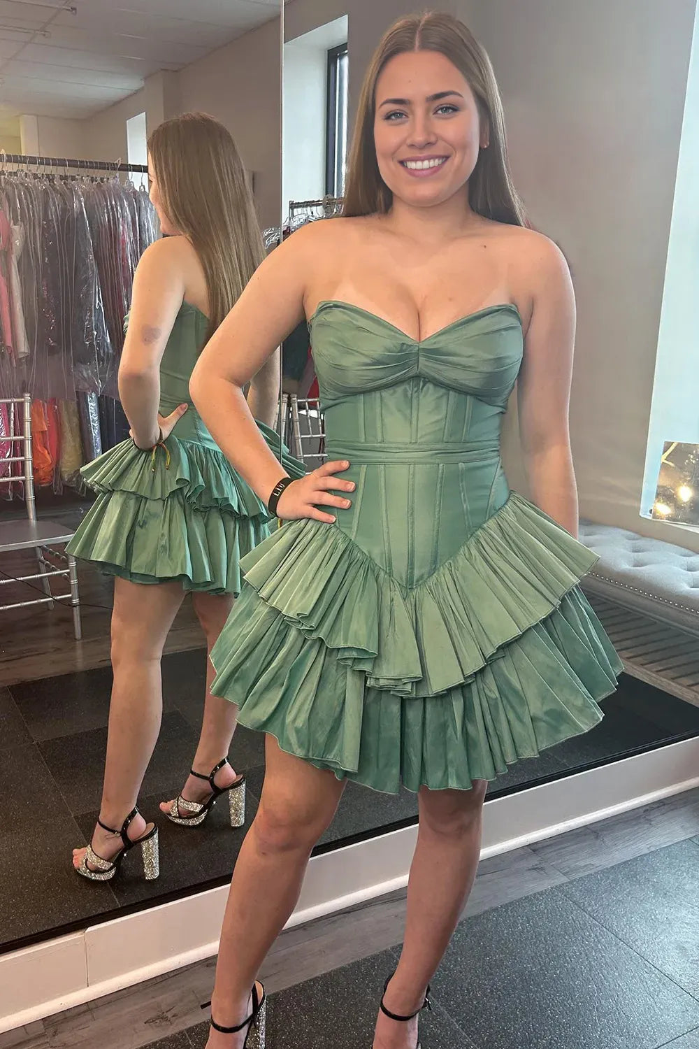 Xuewuba Formal Wear Dresses Green Strapless A-Line Short Corset Homecoming Dress with Ruffles Prom Dress In Store