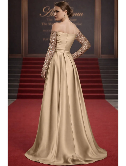 Ball Gown Off-Shoulder Long Sleeves Sequin Satin Champagne Floor Length Prom Dress